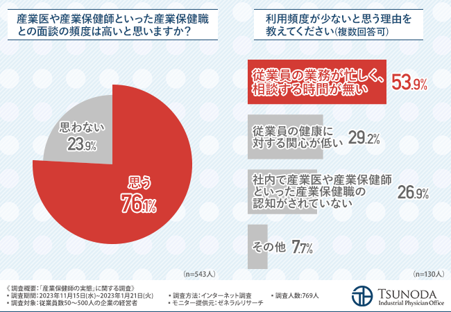 「産業医や産業保健師といった産業保健職との面談の頻度は高いと思いますか?『思う(76.1%)』と回答しました。
