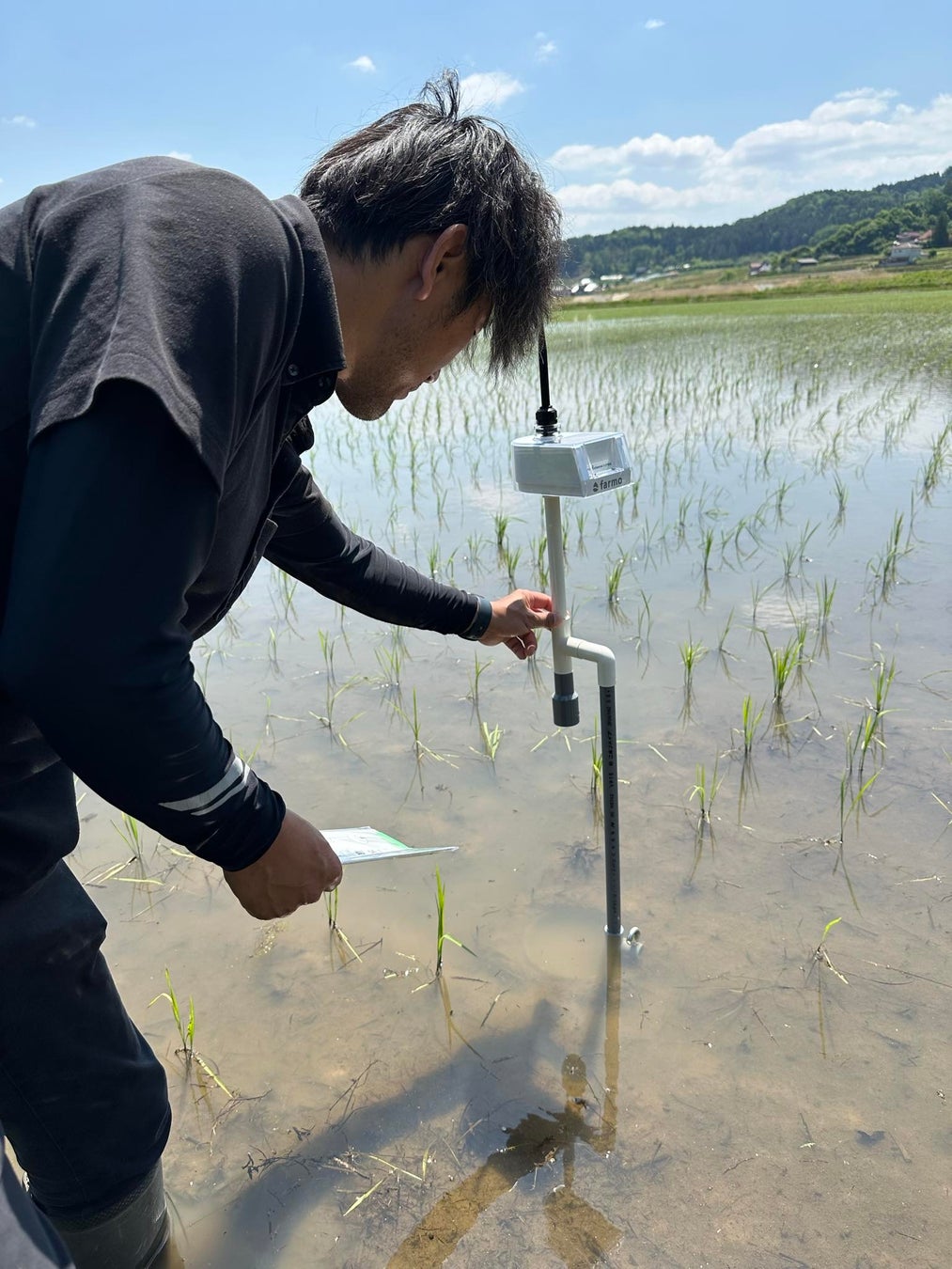 加えて、各圃場には遠方の水田の水位をアプリで一括確認できる水位計を計50台導入しております(farmo社製)。これにより、中干し延長期間中の不正な給水を防止するだけでなく、アプリの異常検知機能を活用することで、迅速なトラブル対応が可能となります。