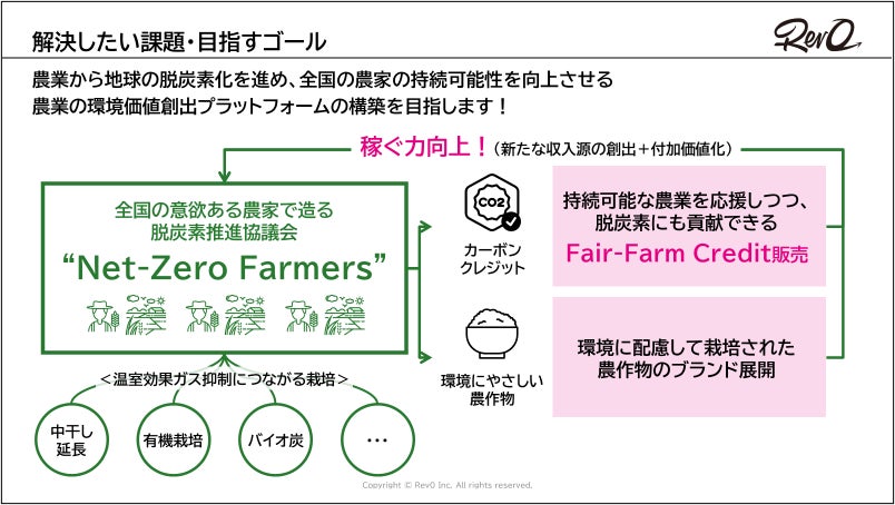 このような課題に対応するためには、地域における新規就農者の増加を促進し、農業の環境的価値を高めることが重要と考えています。そしてこの度、環境価値の創出を通じて農家の稼ぐ力を高め、地域から日本の食の未来を守るという信念のもと、株式会社Rev0、そして全国の意欲ある農家で創る脱炭素協議会であるNet-Zero Farmers(ヨミ:ネットゼロファーマーズ)を設立いたしました。