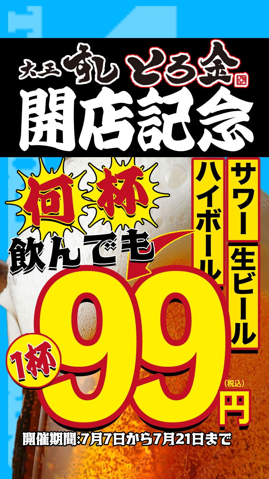 【オープン記念キャンペーン】生ビール・ハイボール・サワーが何杯飲んでも1杯99円!