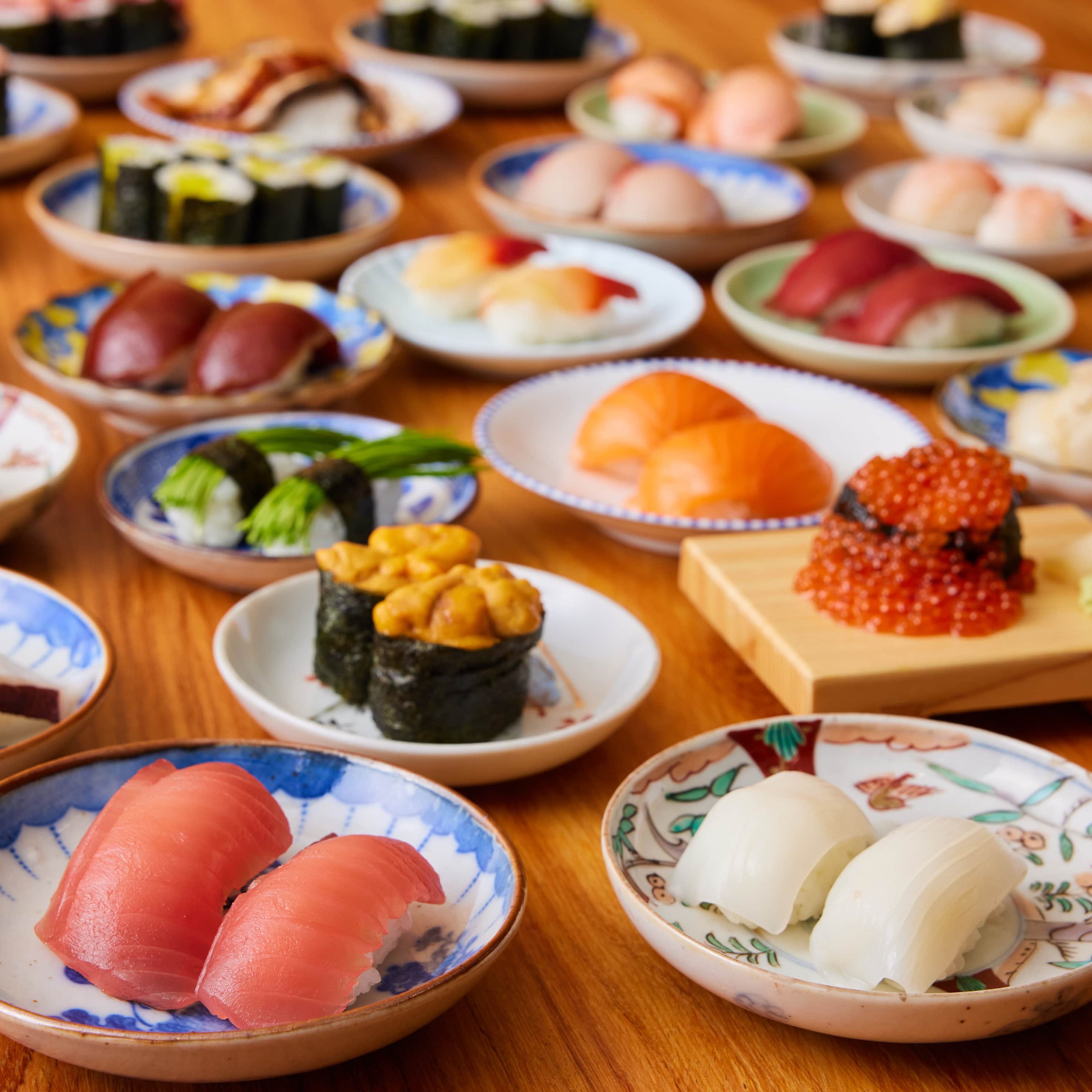 最初に先付け二種、茶碗蒸し、中とろやウニ軍艦も含めた上握り(5貫)を提供したのち、いくらや中とろ、穴子など豪華なお寿司が全て食べ放題となります。炙りに細巻きはもちろん、居酒屋で人気なサイドメニューの逸品をお楽しみいただけます。食べ放題のラストには一人一品ずつデザートを提供します。