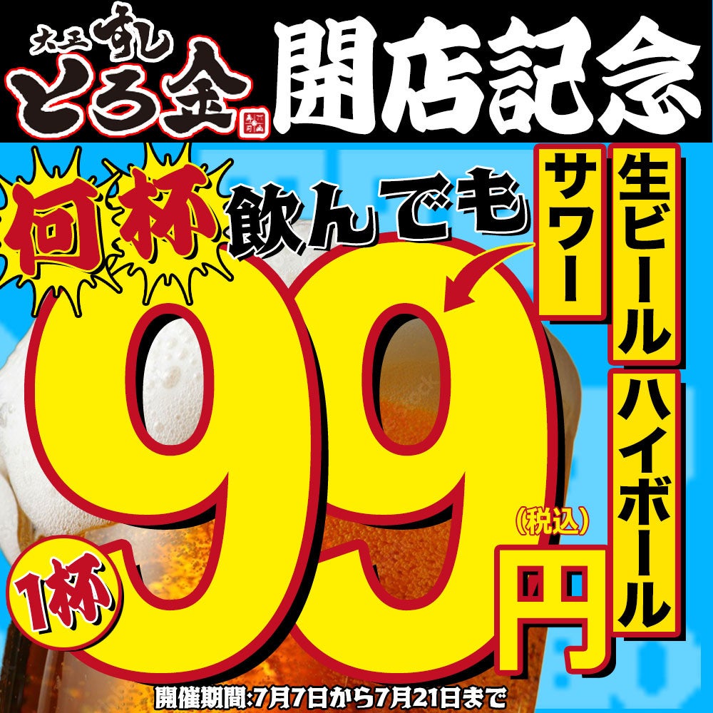 「マグロ問屋直送!マグロの旨い寿司屋 とろ金」のグランドオープンを記念して、生ビール・ハイボール・サワーが何杯飲んでも1杯99円(税込)となるキャンペーンを期間限定で実施いたします。
