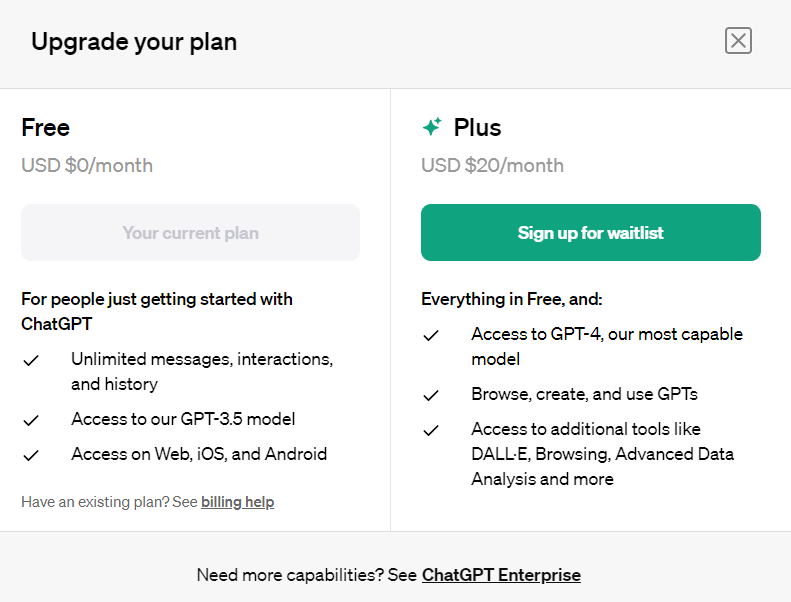 次に、最も重要な価格設定です。 ChatGPT は確かに無料ですが、さまざまな制限もあります。
