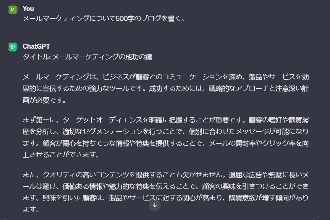 これが ChatGPT の仕組みの核心です。ユーザーがボットに文、要求、質問などのプロンプトを与えると、ボットはそれに応じて応答します。様々なプロンプトやアイデアを試して、ChatGPTに何ができるかを確認することができます。