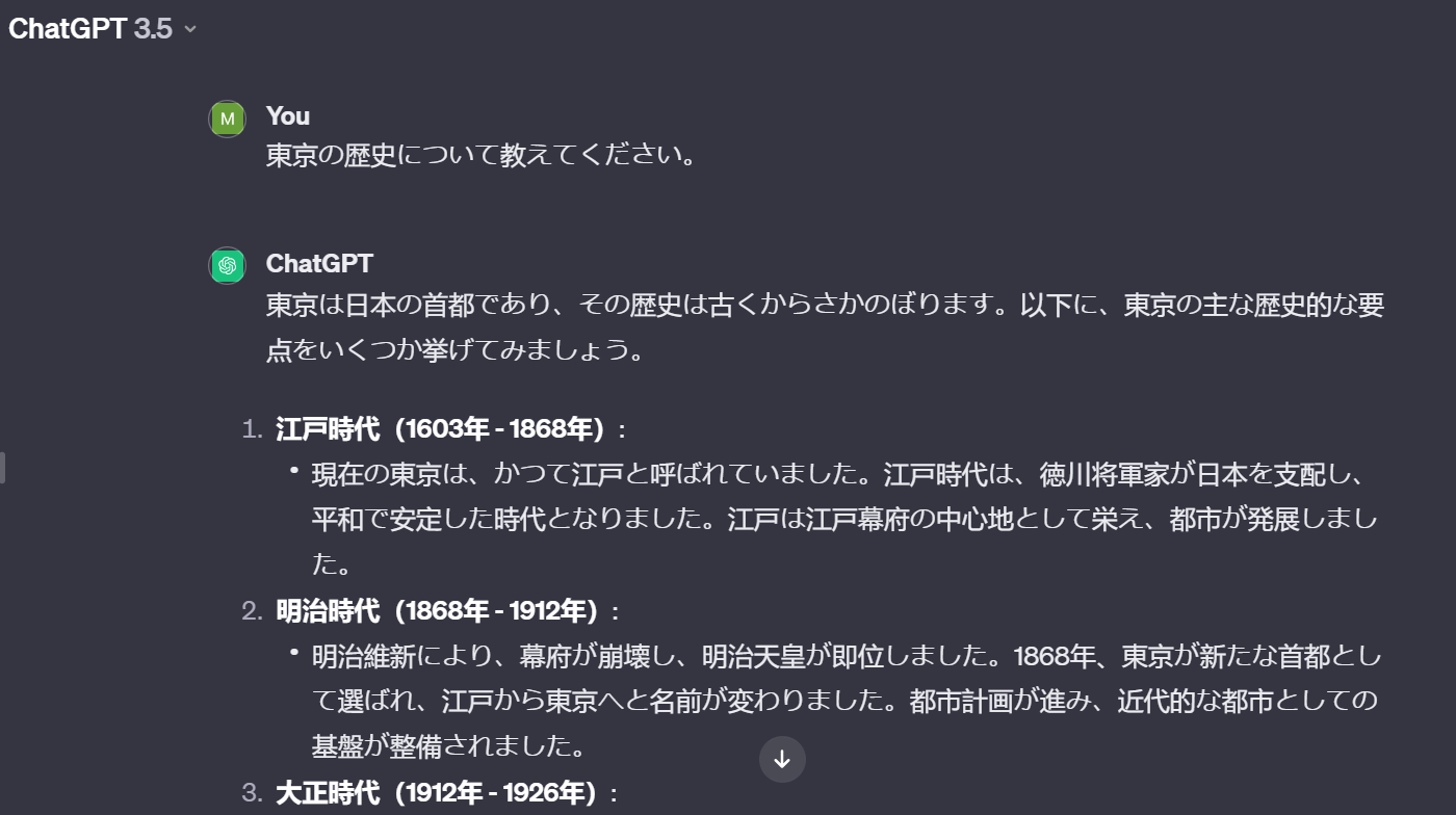 ChatGPT の動作例をいくつか示します。まずは東京の歴史を聞いてみました。