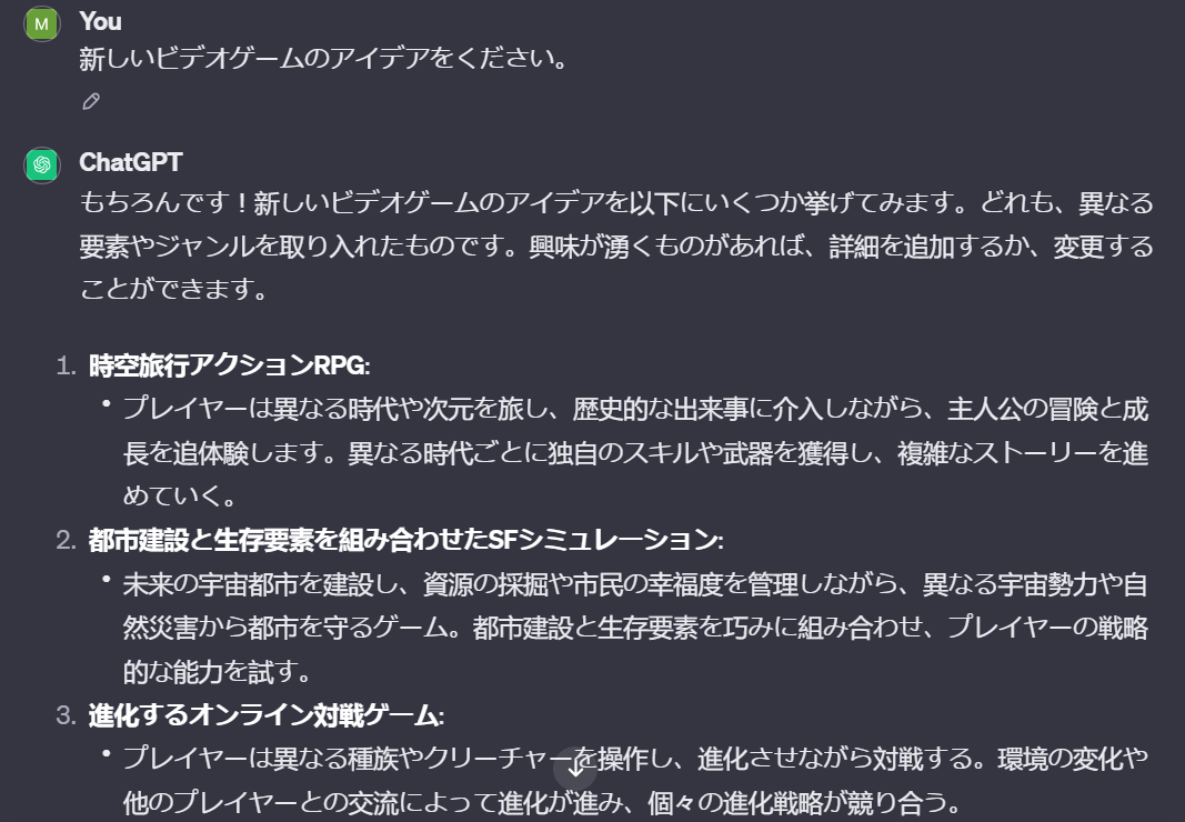 アイデア: ChatGPT にさまざまなテーマに関するアイデアやインスピレーションを与えるよう依頼できます。