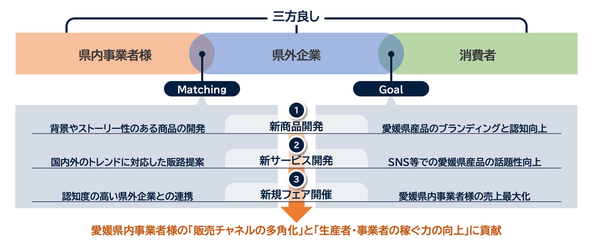 本事業において、愛媛県内外を取り巻く環境・情勢を考慮し、付加価値の高い県産品※3の販路拡大・売上向上を県外企業とのマッチングを通じて実現致します。