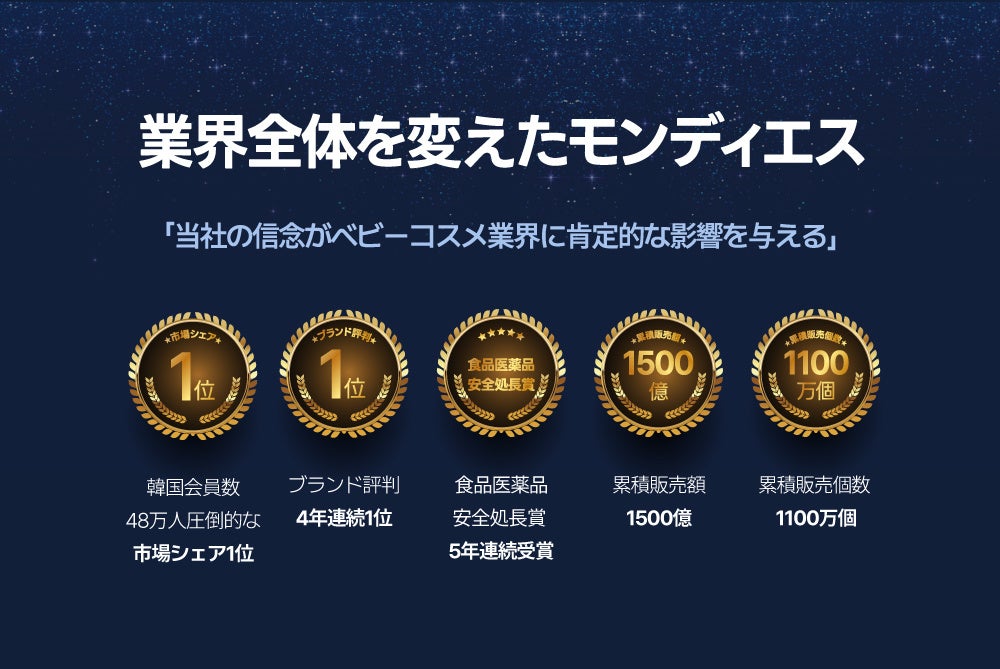 モンディエスは単に売上と販売数が多いだけでなく、韓国にて4年連続で赤ちゃん化粧品部門のブランド評判で1位を占め、韓国の食品医薬品安全処長賞まで受賞しました。 モンディエスがこのような業績を達成できたのは、他のベビー化粧品よりも厳しい基準で製品を生産したからです。 実際、モンディエスは韓国の赤ちゃん化粧品業界では初めて全成分にEWG等級を導入し、世界的にも信頼のあるドイツ皮膚科学研究所のダーマテストで最上位等級であるエクセレント等級まで獲得しました。 その他にもフランス・イブのビーガン認証、アメリカ・PETA認証など韓国国内での認証にとどまらず、世界的に信頼性のある機関からの厳しい審査を通過した製品です。 このように厳しい検証を通過した成分のみを製品に使用したことで、美容大国である韓国で4年連続1位という快挙を達成しました。 今でも韓国ではベビーアトクリーム、新生児オールインワンボディウォッシュ、ベビー用アトローション、ベビーヒップクレンザーがベストセラーになっています。