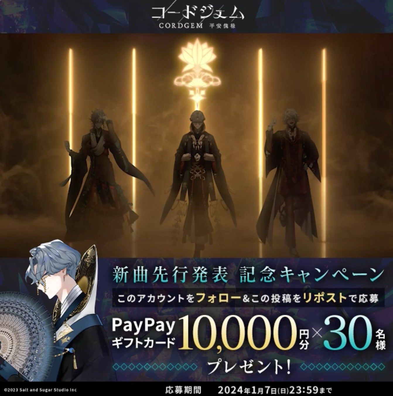 X(旧Twitter)キャンペーン実施中! 新曲第1弾の先行発表を記念して、フォロー&リポストキャンペーンを開催します。応募期間内に、コードジェム公式アカウントをフォローし、キャンペーン投稿をリポストすることで、PayPayギフトカード10,000円分が合計30名様に当たるキャンペーンを開催します。