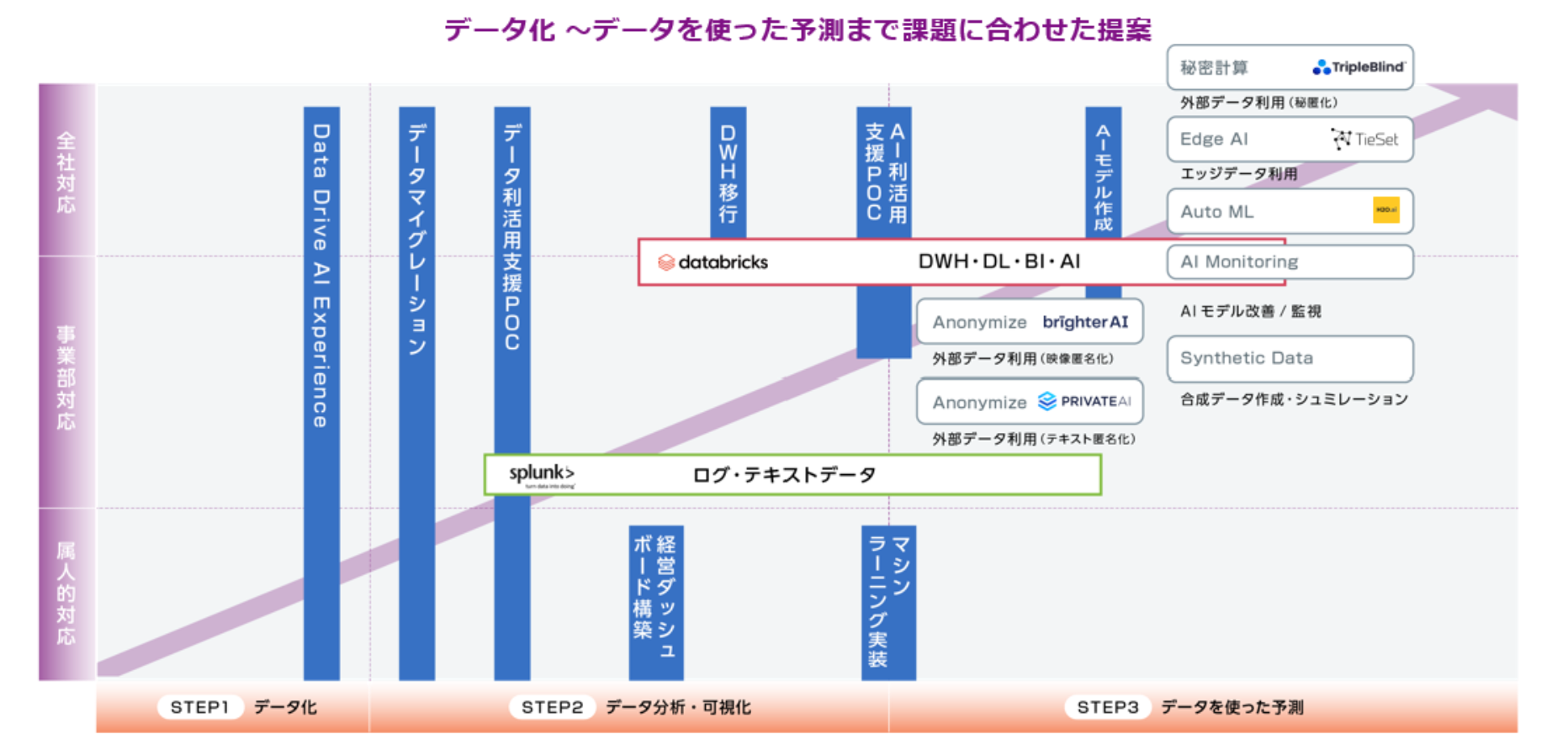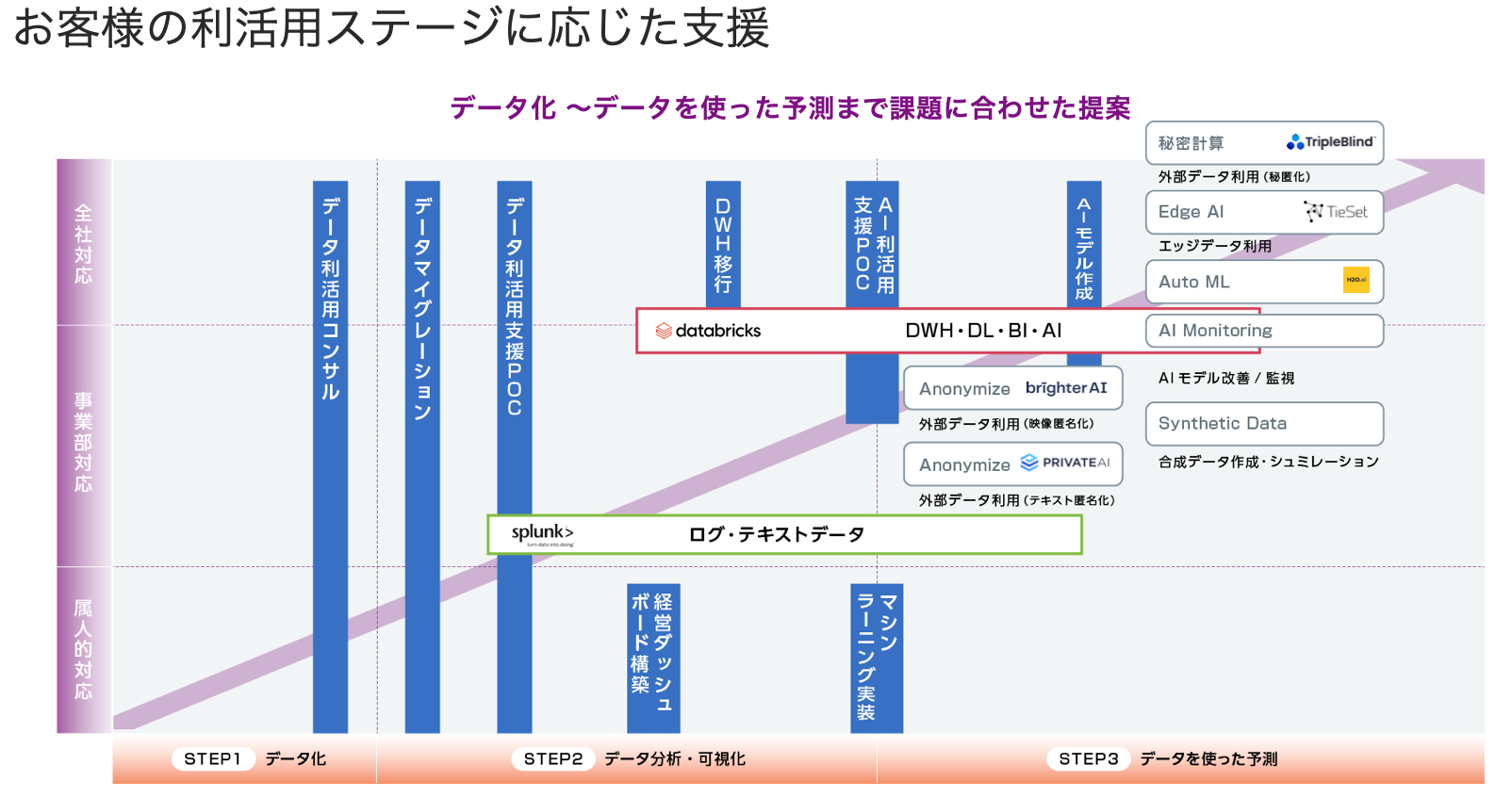 マクニカでは、データ利活用を推進するためのソリューションとしてSplunk(データ分析プラットフォーム)、データブリックス(データインテリジェンスプラットフォーム)、brighter AI(次世代映像匿名加工技術)、TripleBlind(秘密計算を活用したプライバシー保護)、TieSet(連合学習を活用したエッジコンピューティング技術)といった幅広いラインナップを揃え、企業の要望や課題に沿った環境を実現しています。上記に加え、今回のPrivate AI(次世代テキスト匿名加工技術)の提供により、幅広く企業のデータ・AI利活用が可能となります。