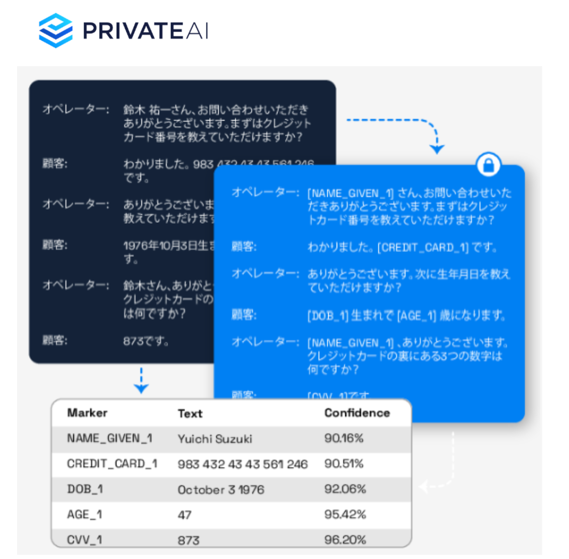 Private AIは、ユーザーが大規模言語モデル(LLM)に情報を入力する際、また自社データを使ってモデルのファインチューニングをする際に、独自の機械学習アルゴリズムを活用して機密情報や個人を特定できる情報(以下PII)を自動的に編集し、データプライバシーを確保したAIの利用を可能にするサービスを提供しています。このサービスは、日本語を含む52か国の言語に対応し、50以上のデータ種別に対応しています。特筆すべきは、単なるルールベースではなく、大量のデータでトレーニングされたAIによってPIIを検出しており、その精度が非常に高い点です。さらに、Private AIはPIIだけでなく、個人保健情報(PHI)やクレジット情報(PCI)など、高度な機密性を要する情報にも対応しています。また、日本独自のデータ種別(マイナンバーや日本の住所など)にも対応しています。これにより、国際的かつ多岐にわたる利用環境で、高いデータプライバシーを確保しながらAIテクノロジーの恩恵を最大限に享受できる点がPrivate AIの強みとなっています。