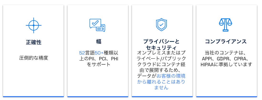 PrivateAIはプライバシーと機械学習の専門家により2019年に設立されたトロントに本社を置くテクノロジーカンパニーです。独自の機械学習アルゴリズムを用いてテキスト、PDF、トランスクリプト、大規模言語モデル(LLM)などへ52以上の多言語で、50種類以上の個人を特定できる情報(PII)を検出、再編集、置換します。近年企業が取り扱うデータ流通は日々増えていますが、PrivateAIによりAIの運用やデータ分析の際に個人情報保護法やGDPRなどの法における個人情報を、個人識別符号を含めて網羅的にリアルタイムで必要な処理をすることができます。日本へは2023年9月に進出し、ガートナー社のプライバシー分野におけるCool Vendors 2023に5社中の1社として選出されています。