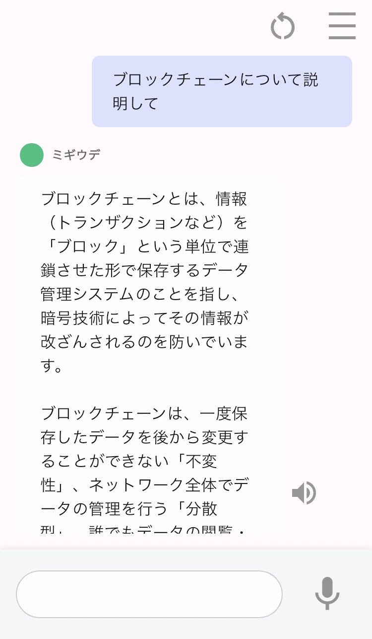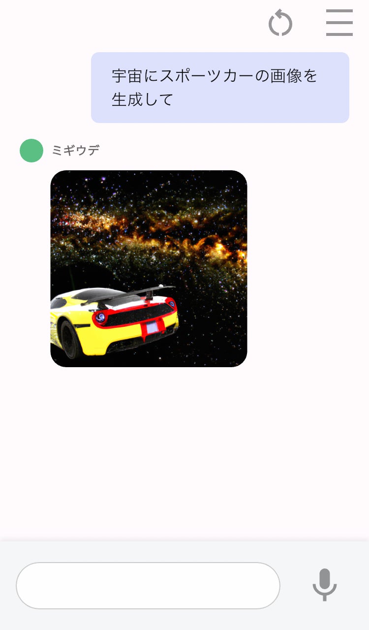 音声の誤認識をカバーできるよう、音声入力の後はテキストが表示され、紙飛行機ボタン(決定ボタン)をタップするだけで音声で回答、画像生成がチャット形式で返ってきます。