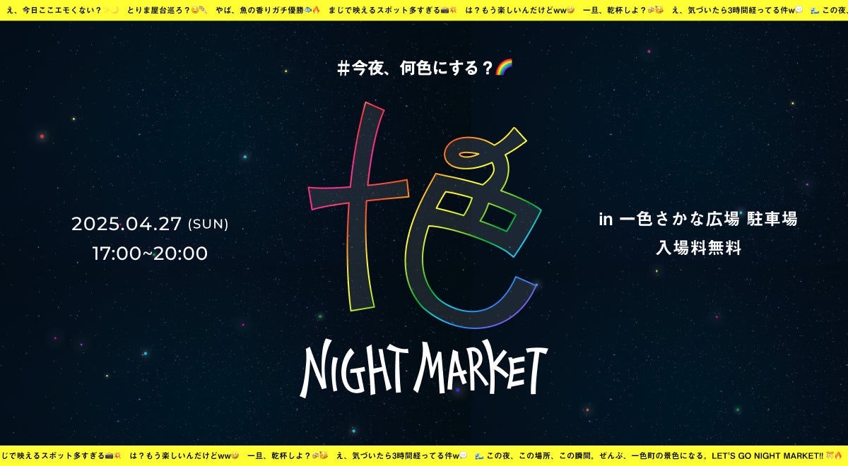 2025年4月27日(日)愛知県西尾市一色町にて、地域の魅力を再発見し、観光客や移住希望者、そして地元住民が一堂に会する新しい形のナイトマーケットを開催いたします。このイベントは、単なるマーケットにとどまらず、「色」をテーマにした新しい形の交流の場を提供。10個のコンテンツを元に、地域の人々が自然に繋がり、異なるバックグラウンドを持つ参加者同士が楽しみながら交流できる機会です。地域の魅力を発見し、心温まる体験を提供するこのユニークなナイトマーケットにぜひご参加ください。