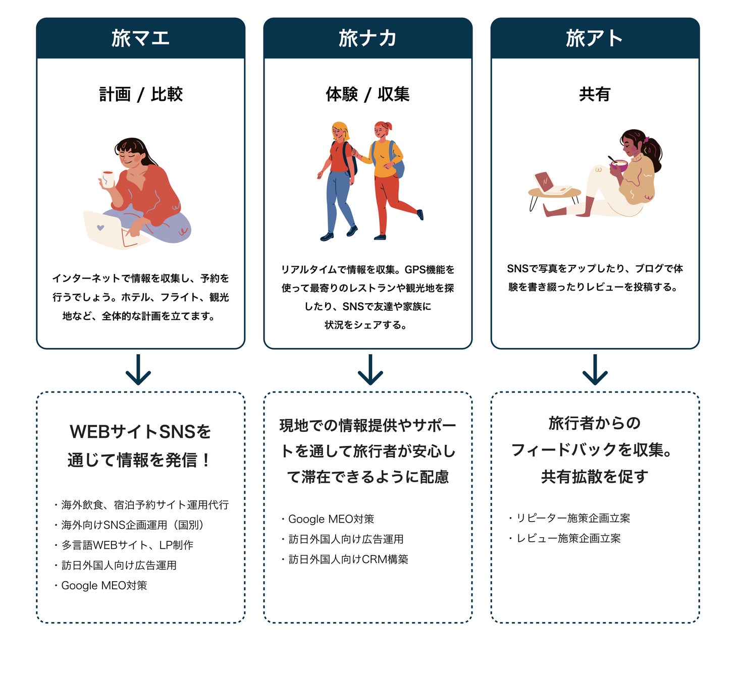 訪日外国人に対して旅前、旅中、旅後の3つのアプローチ