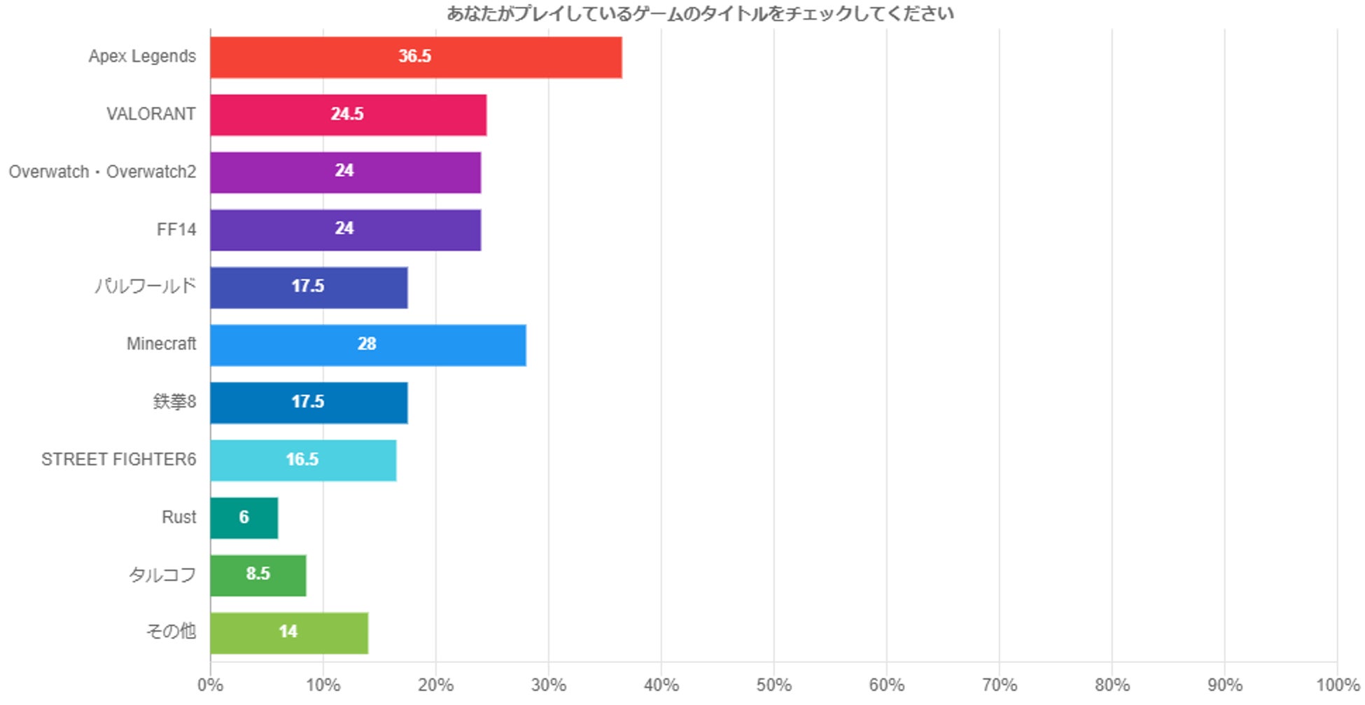 現在もっともプレイされているゲームは、Apex Legends(36.5%)という結果になりました。