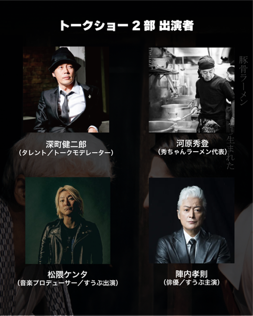 今回のリリースイベントは、陣内孝則さん、深町健二郎さん、河原秀登さん、しゃかりき光さん、松隈ケンタさんなど豪華ゲストをTHEATER 010にお招きして2024年2月に公開する映画『すうぷ』の撮影時の裏話や、世界中で食べられているとんこつラーメンや屋台の歴史について色々とお話していただきます。