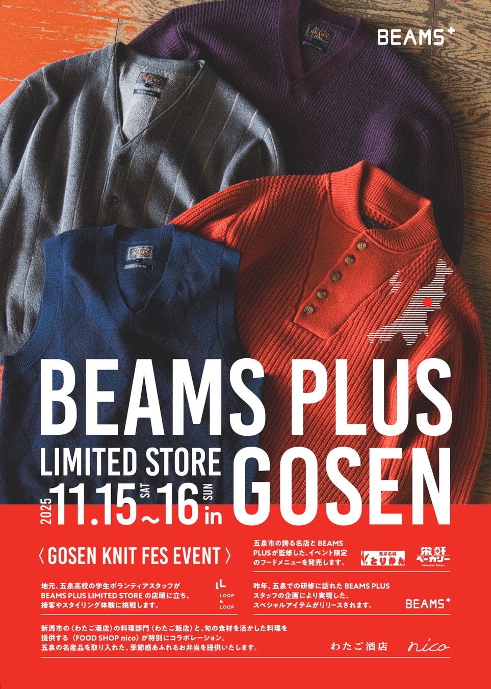 会場では、五泉産地で共に制作した限定アイテムを中心に、BEAMS PLUSのディレクターやスタッフが来場者へ五泉ニットを活かしたスタイリングを提案します。