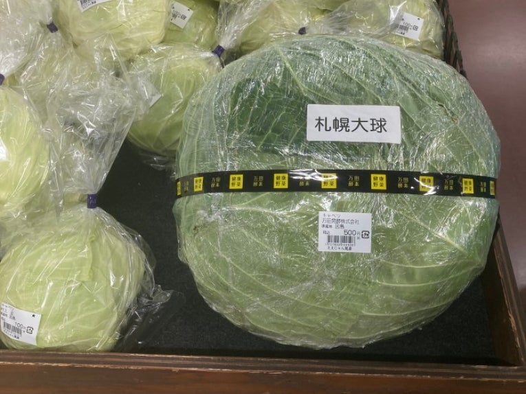 今回栽培したのは、札幌大球という品種です。北海道の伝統野菜であり、規格外の大きさと重さ、それゆえ収穫作業が大変という理由で、近年は北海道でもほとんど栽培されていない希少な品種です。栽培にあたっては、ジャンボ大根と同様、肥料や水の散布量、病害虫対策など様々なことに注意を払い、また、大きく育てるために、畝間・株間を大きくとりました。