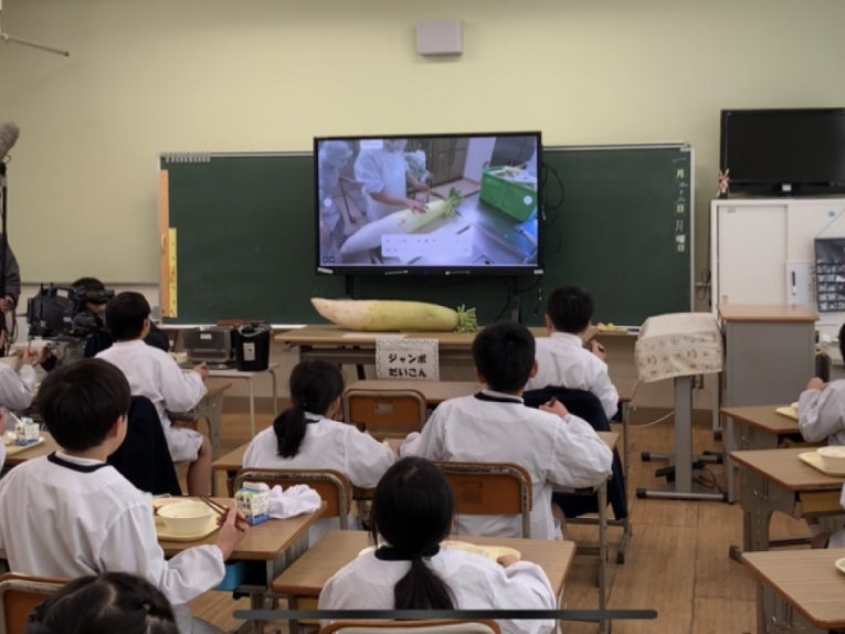 2024年1月に、収穫したジャンボ大根を因島島内の小中学校5校に無償提供し、提供したジャンボ大根が、給食(1,090食分)の食材として活用されました。子どもたちはジャンボ大根の大きさと重さに驚き、給食を食べた際はその美味しさ、甘さにまた驚いていました。ANAクラウンプラザホテル広島様には、ジャンボ大根がブッフェメニューの食材として提供されています。なお、HAKKOパークでは2月末頃まで、畑に植えられているジャンボ大根を間近で見ることができます。