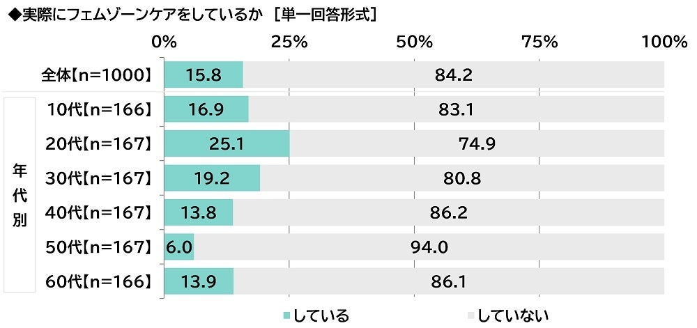 「実際にフェムゾーンケアをしている」全体の16%、20代では25%