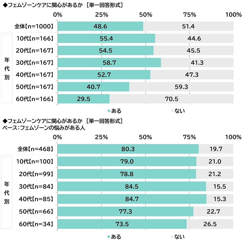 「フェムゾーンケアに関心がある」全体の49%、30代では59%