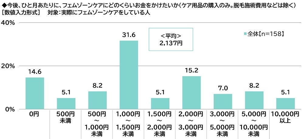 また、今後、ひと月あたりに、フェムゾーンケアにどのくらいお金をかけたいか聞いたところ、「1,000円~1,500円未満」(31.6%)に最も多くの回答が集まったほか、「2,000円~3,000円未満」(15.2%)にも回答が集まり、平均は2,137円でした。