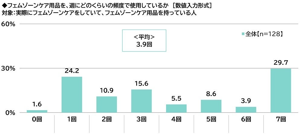 フェムゾーンケア用品を持っている人(128名)に、フェムゾーンケア用品を、週にどのくらいの頻度で使用しているか聞いたところ、「1回」(24.2%)や「3回」(15.6%)、「7回」(29.7%)に回答が分かれ、平均は3.9回でした。週に1回程度使用する人と、ほぼ毎日使用する人が高い割合となりました。