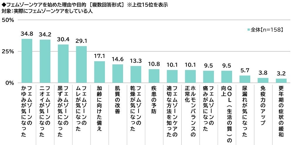 実際にフェムゾーンケアをしている人(158名)に、フェムゾーンケアを始めた理由や目的を聞いたところ、「フェムゾーンのかゆみが気になった」(34.8%)が最も高くなり、「フェムゾーンのニオイが気になった」(34.2%)、「フェムゾーンの黒ずみが気になった」(30.4%)、「フェムゾーンのムレが気になった」(29.1%)と続きました。フェムゾーンのトラブルや不快感がきっかけになっているケースが多いようです。また、「加齢に向けた備え」(17.1%)や「肌質の改善」(14.6%)、「疾患の予防」(10.8%)も上位に挙がりました。