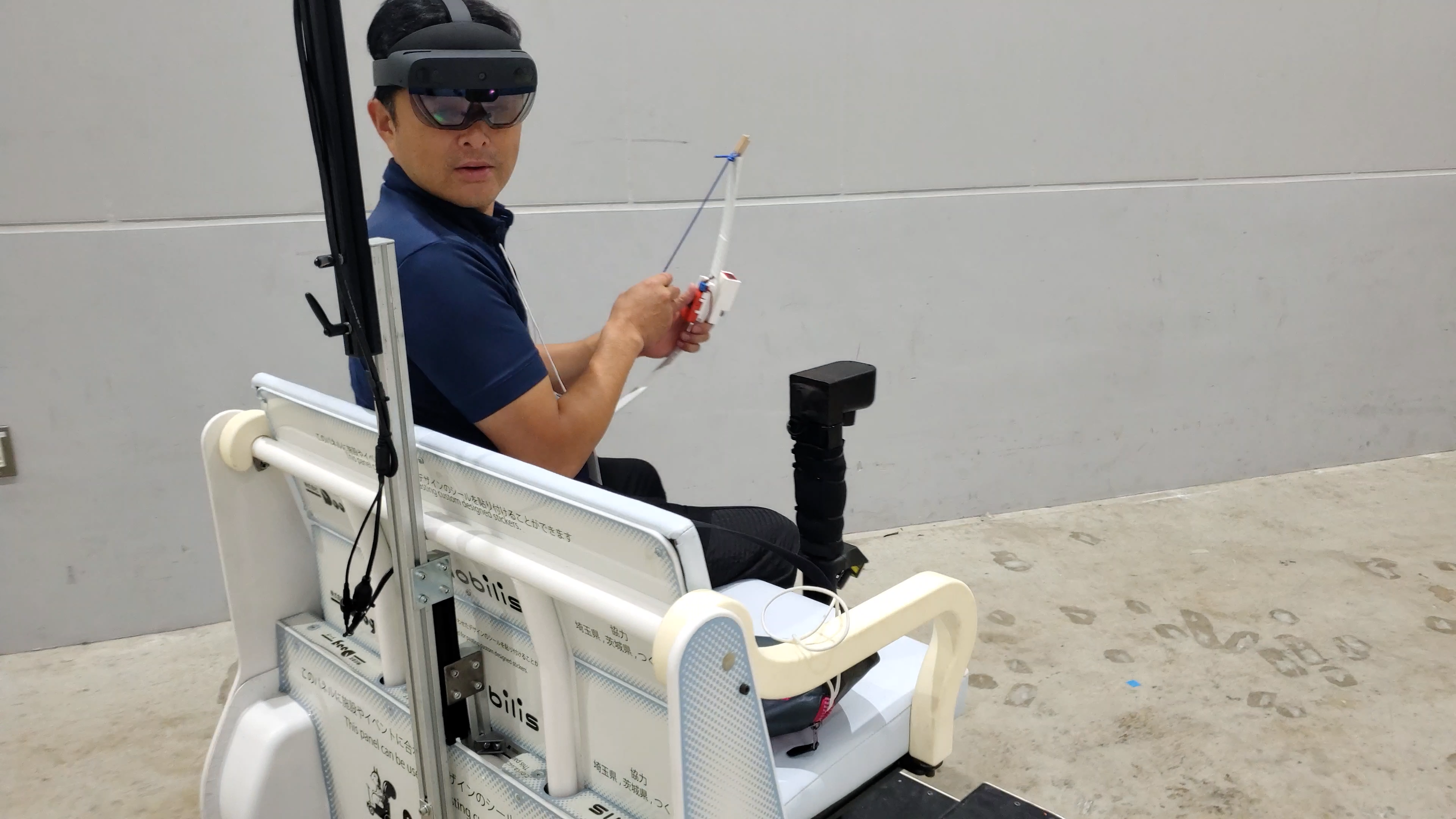 体験者は、単独⾃⾛式モビリティロボット「モビリス」に搭乗し、HoloLens 2を装着します。何もない地⾯・空間の中を、事前に設定されたルートで⾃⾛するロボットライドに乗り込み、HoloLens 2によって具現化されたバーチャルコンテンツの中を⾛⾏し、別途開発された「⼸⽮型デバイス」を使って聖なる⽮を撃つことで悪い魔法使いに呪いをかけられてしまった動物たちを助けに⾏く、およそ3分ほどの冒険の旅に出発するコンテンツです。