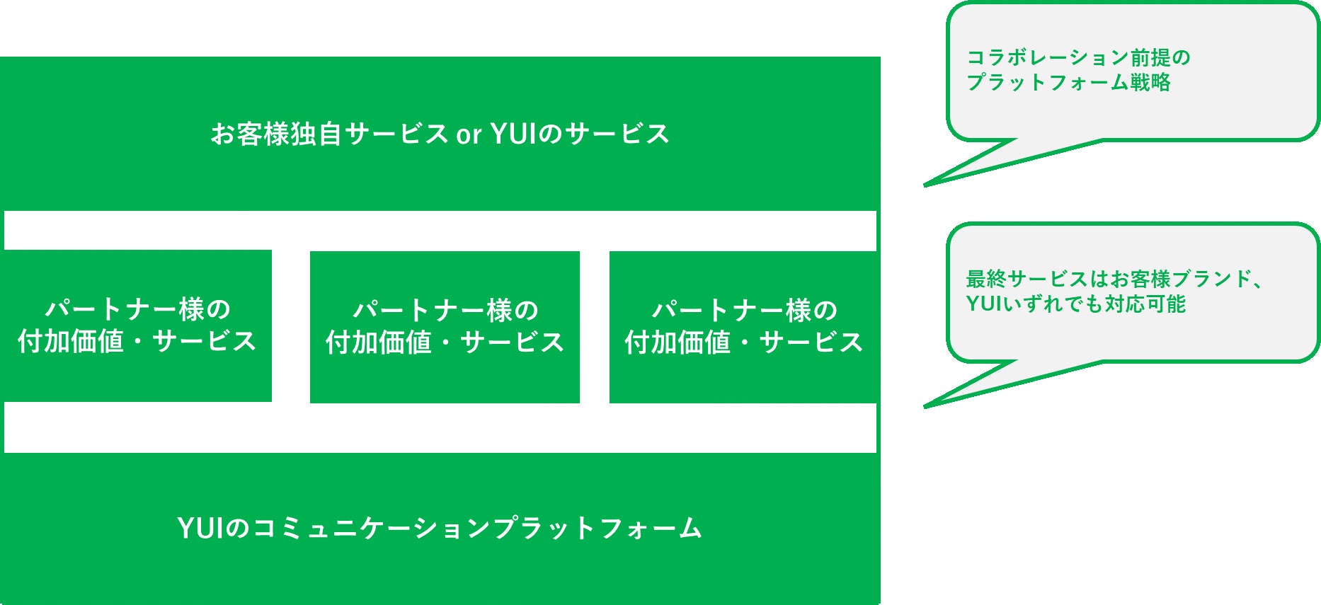 YUIのコミュニケーションプラットフォームはパートナー様との協業を前提にしております。パートナー様の持つ付加価値またはサービスと連携することでオリジナルな形を素早く提供できるように技術・ビジネスモデルの両面で柔軟に対応可能です。VUCA※の時代の新たな形を常に変化させながら提供して参ります。