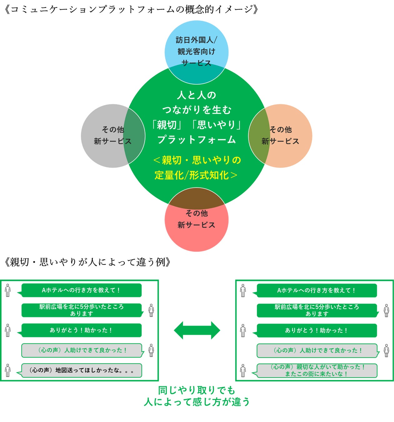 多種多様な文化的背景や価値観、個々人の過去の経験に基づく景によってそれぞれの個人が心地よいと感じる「親切」や「思いやり」は違うという前提の下で、コミュニケーションプラットフォーム上の各種サービス提供を通じて「親切」や「思いやり」の「定量化/形式知化」を進めて参ります。