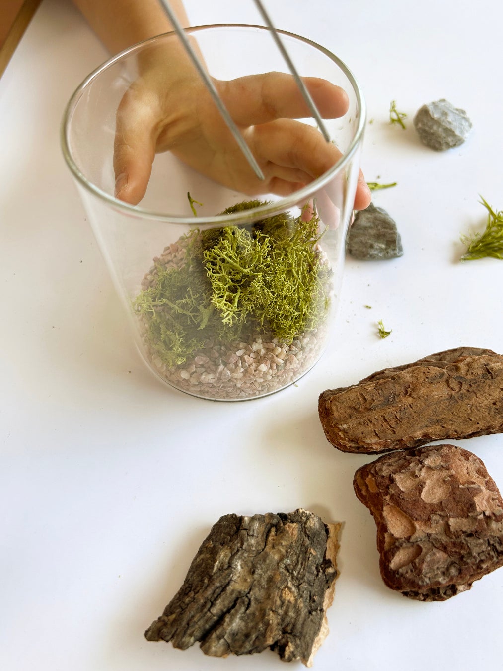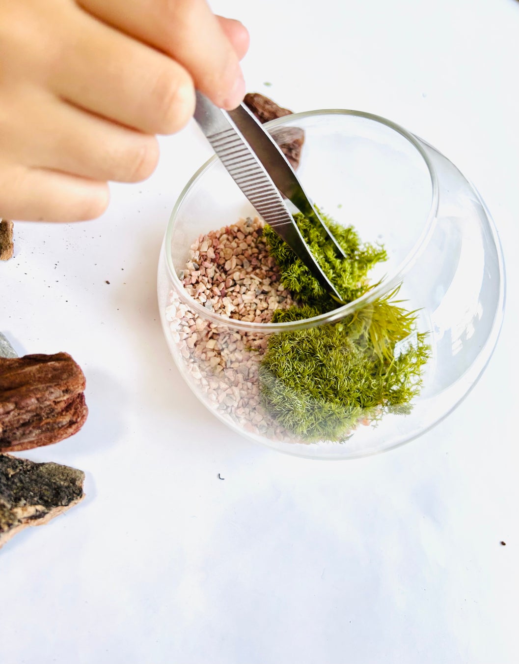 苔や砂利を使って、小さな自然の物語をつくりましょう。