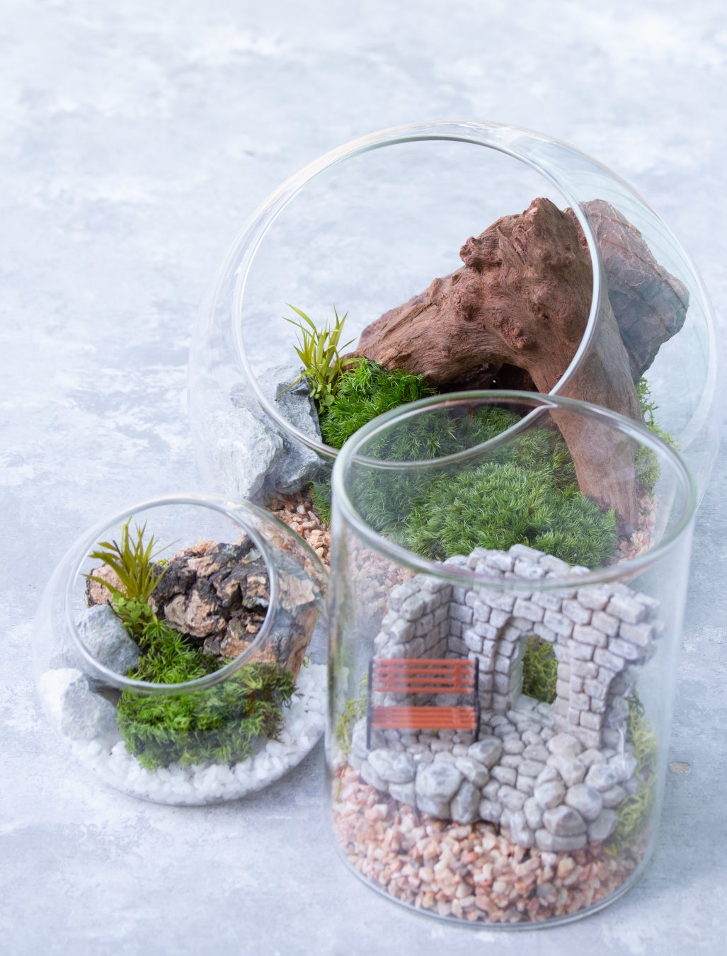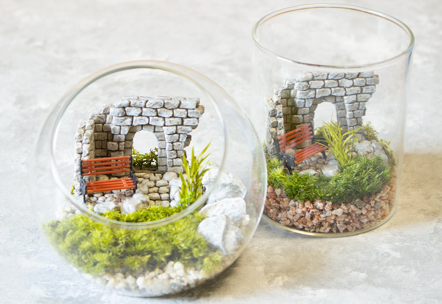 今回の新商品では、既存のガラスドーム(Φ12cm)とガラスポッド(Φ8.5cm)に、レンガ調の建物やベンチなどのミニチュアパーツを配置し、奥行きある小さな風景を表現。苔や砂利の配置にもこだわり、自然の息吹を感じられる設計です。