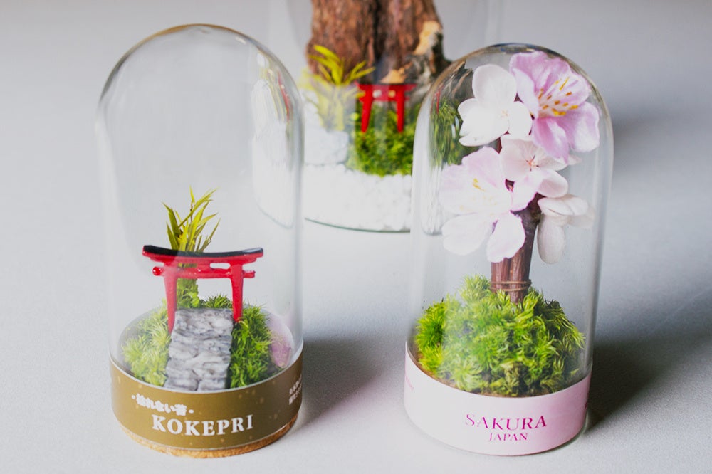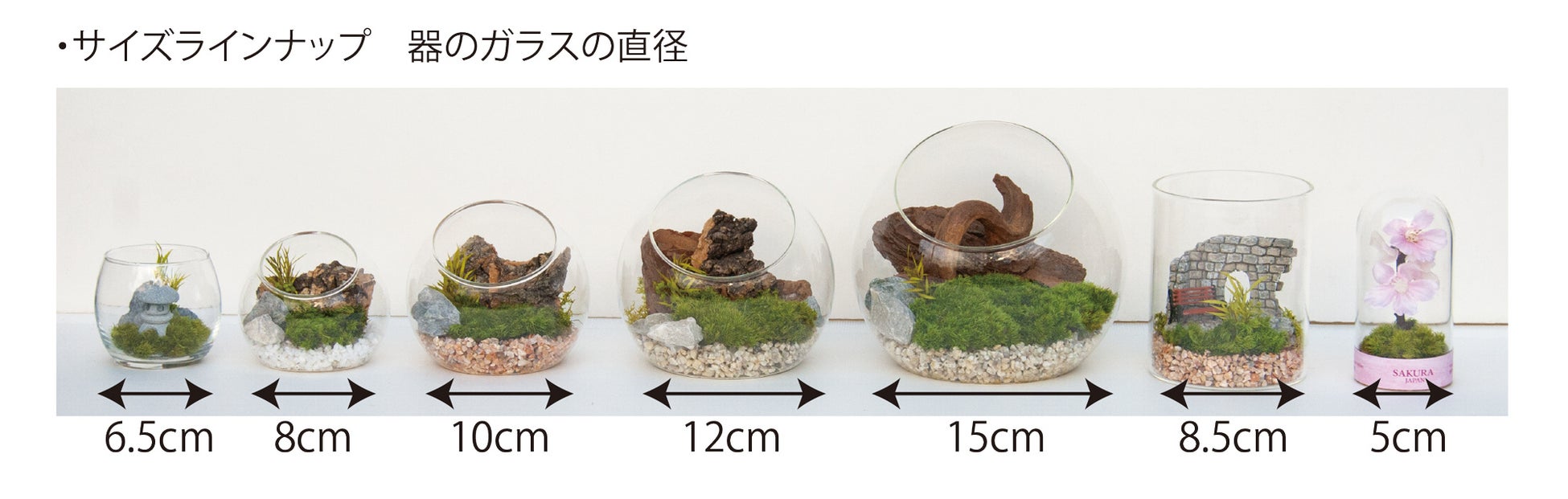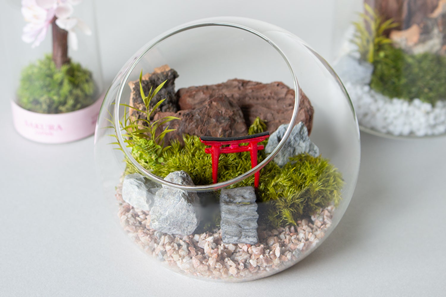 蓋付きのガラス容器にプリザーブド苔を敷き詰め、日本の風景をコンパクトに表現した、和風デザインの人気シリーズ。手のひらサイズで、ギフトや旅行土産に最適です。
