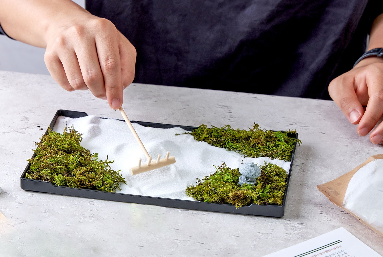水を使わず、苔や石・砂で自然の風景を表現する日本伝統の“枯山水”を、自宅で楽しめるキットです。必要な素材一式が揃っており、手軽にミニチュア枯山水作りを体験いただけます。