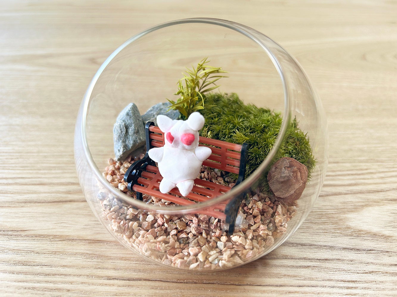 ベンチには、お好きなフィギュアを自由に配置可能。たとえば動物のミニチュアや旅人のフィギュアを座らせることで、自分だけのストーリーが生まれます。