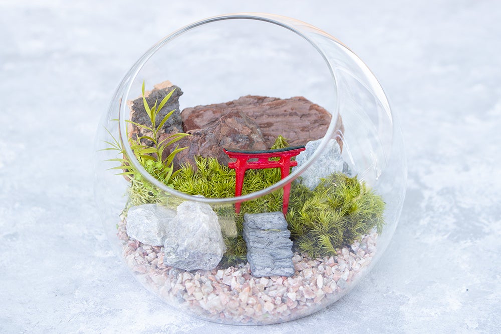 ガラスドーム・ガラスポッド 鳥居タイプ 直径8cmから12cmのガラスドームおよび直径8.5cmのガラスポッドに、苔を敷き詰めて“和”の情景を再現いたします。飾る場所に応じてサイズをお選びいただけます。