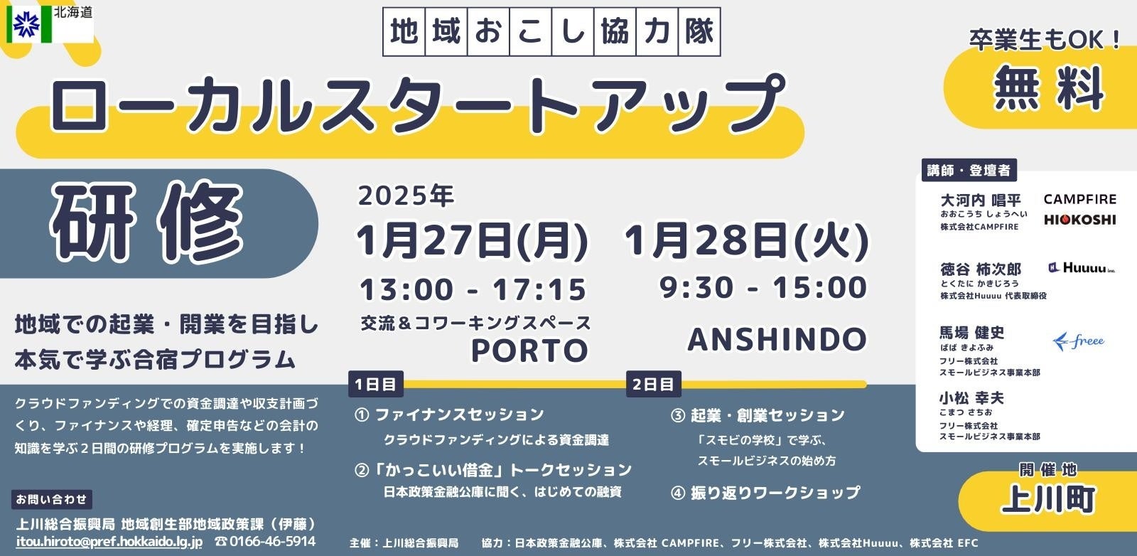 主催は北海道上川総合振興局ながら、日本政策金融公庫、EFC、freee、CAMPFIRE、Huuuuといった民間企業が協力。これまでの座学型研修とは異なり、現場の実務家による実践的な内容が特徴です。