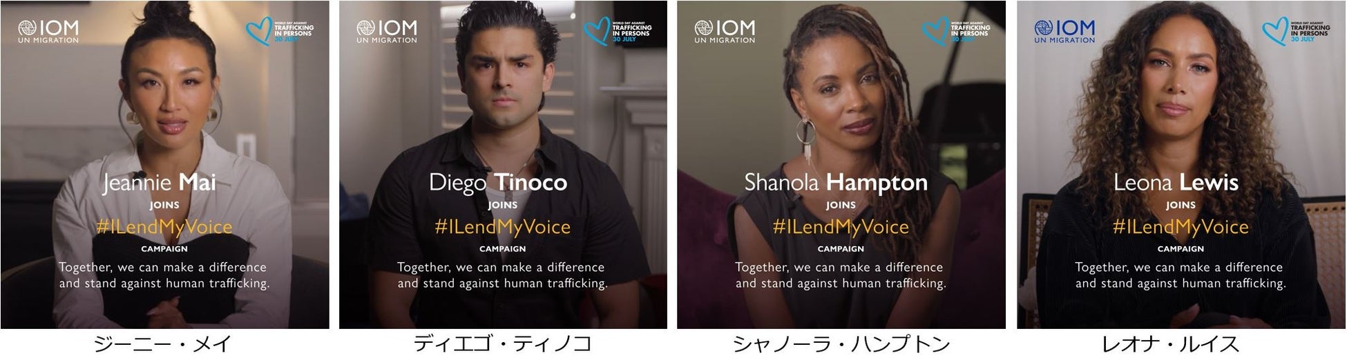 IOMは、テレビ司会者兼プロデューサーとして活躍するジーニー・メイとパートナーを組み、著名人が彼らの声を代読することで、私たちは人身取引被害者が直面する過酷な経験に光を当て、共感を呼び、そして撲滅へ向けた一歩を促す「I LEND MY VOICE - 私の声を与えよう」キャンペーンを立ち上げました。
