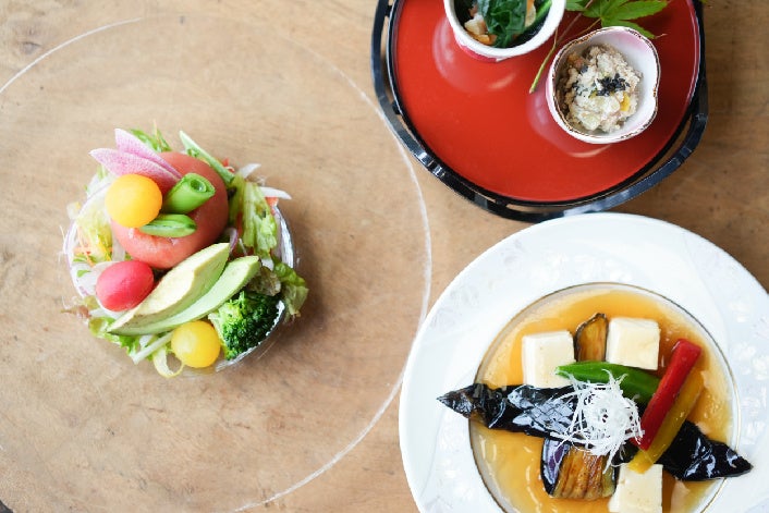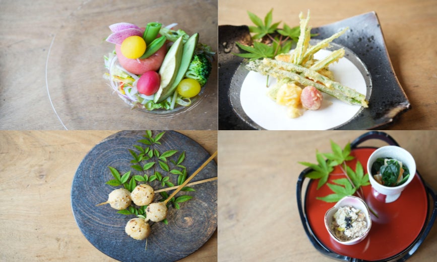 左上:地野菜を中心とした野菜サラダ、右上:四季折々季節野菜の天麩羅