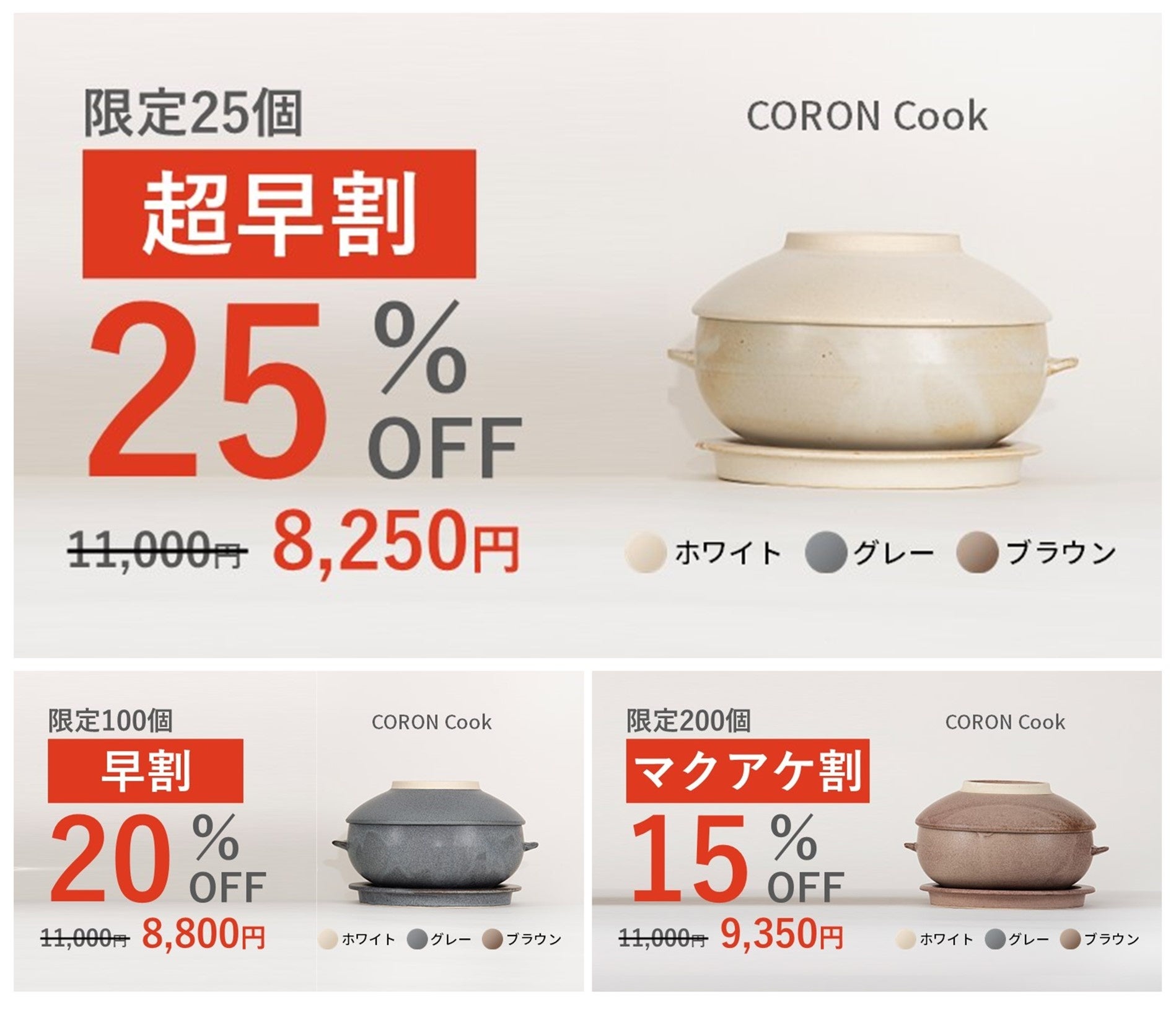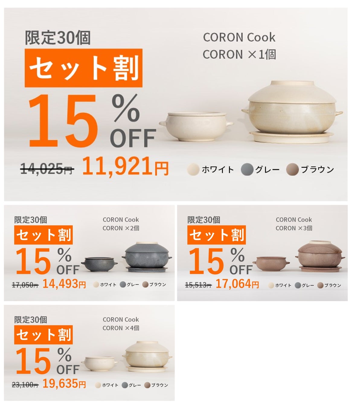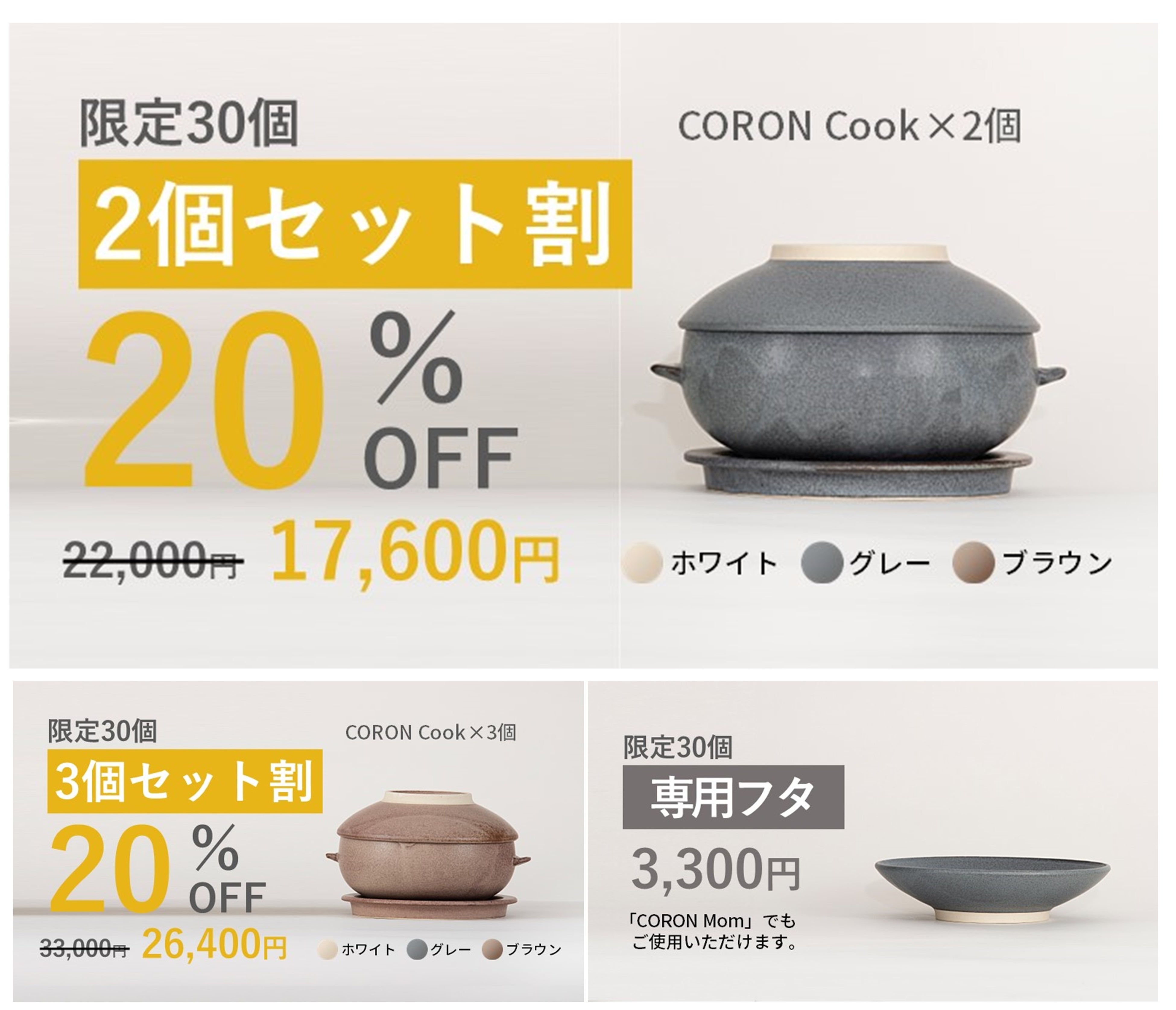 プロジェクト開始から大変ご好評をいただき、「CORON Cook」単品の25%オフ、20%オフは完売致しました。