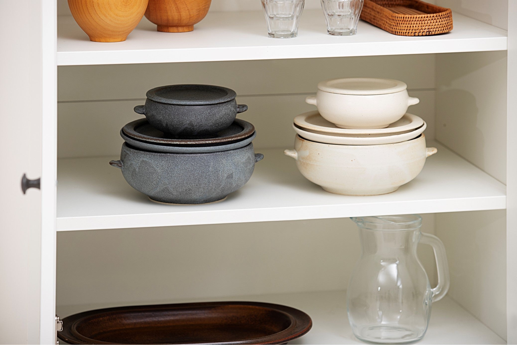 丸みのあるデザインにより、ごはんの熱が逃げにくく、すくいやすくなっております。また持ち手は、機能的かつ食器としても見栄えのあるデザインを追求しました。敷き皿をフタとして使うことで重ねて収納することができます。棚に置いてるだけでインテリアのアクセントになります。