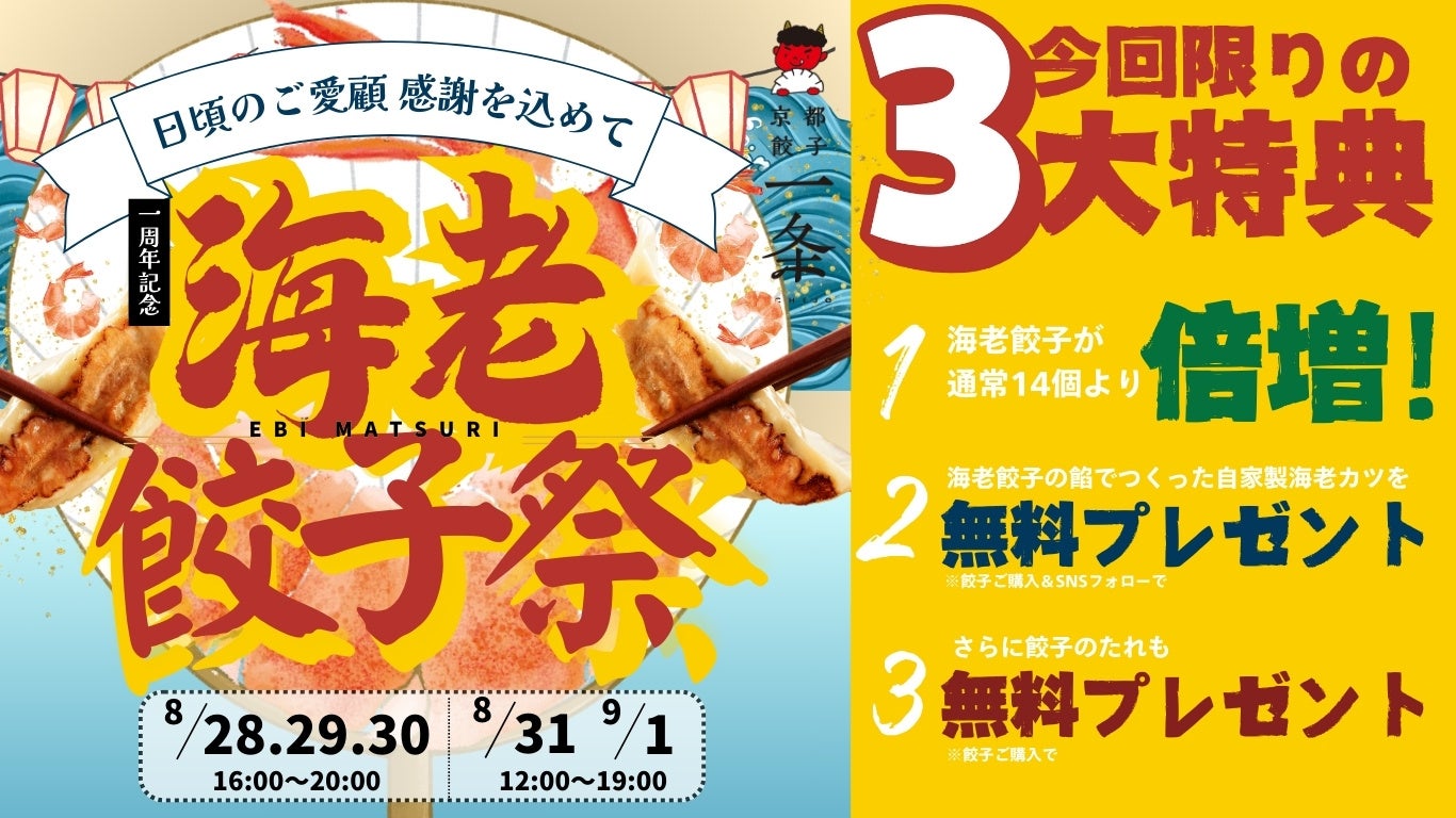 8/28~9/1(時間限定)「一周年記念「海老餃子祭」開催決定!~特典盛りだくさんの5日間限定イベント~」主催:京都餃子一条