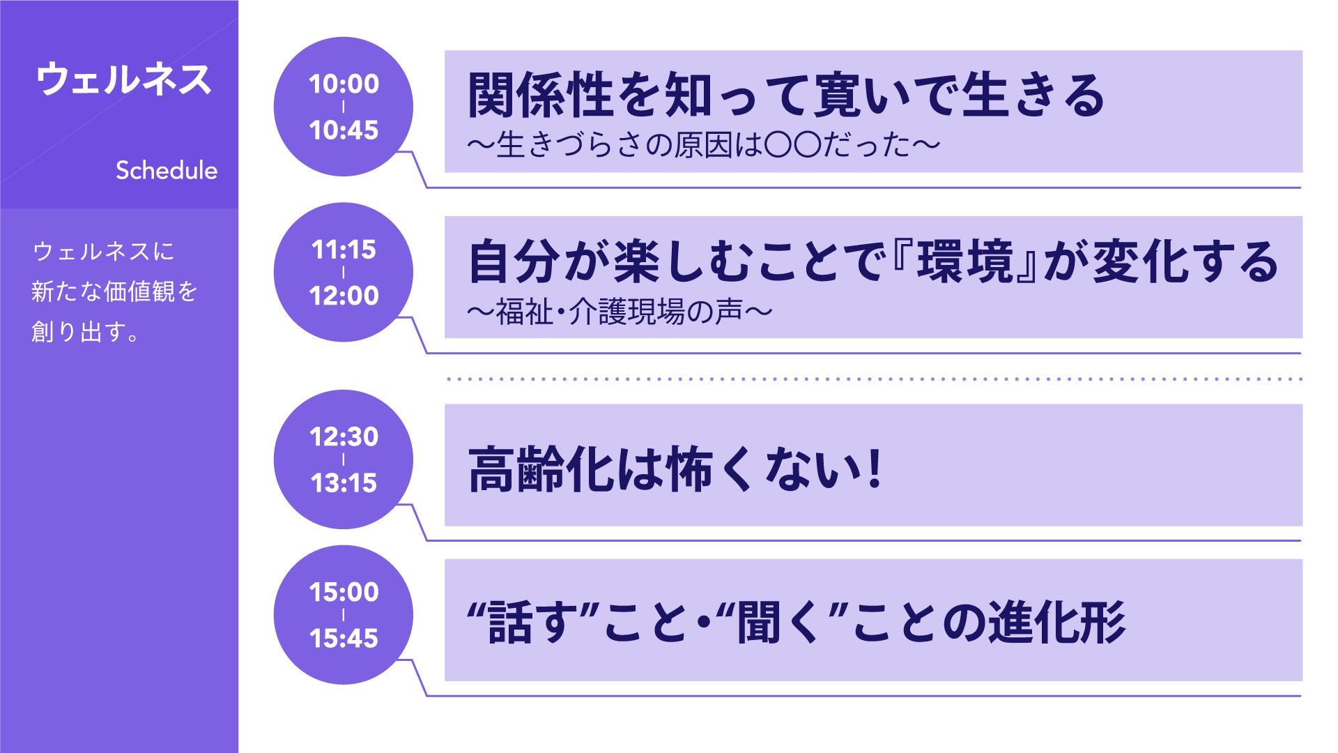 多くの人が生きづらさを感じる今、ウェルネスという概念が注目されています。健やかな毎日を送るには、身体的な健康は元より精神的な健康も重要です。周囲との関係性に対する生きづらさを感じていたり、本音を話すことや聞くことができなかったり、閉塞感のなかで暮らす人々。それらからの状況から解放されるための役立つ情報や高齢化社会でも全力で生きていく秘訣、笑顔溢れる福祉・介護現場の声など、塞ぎがちな人たちが元気で暮らすためのウェルネスコンテンツを用意しています。