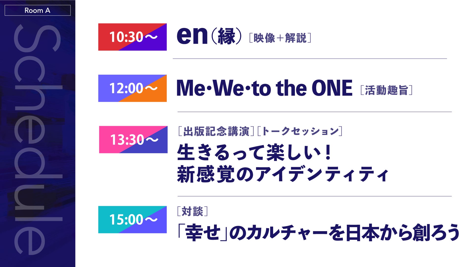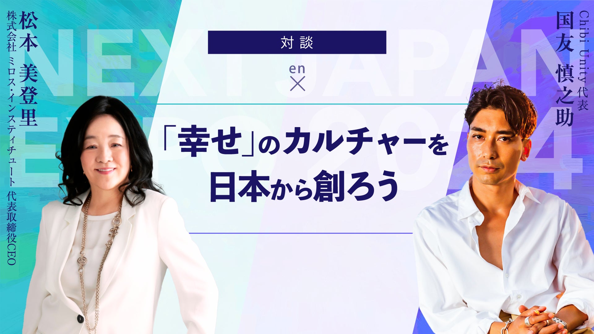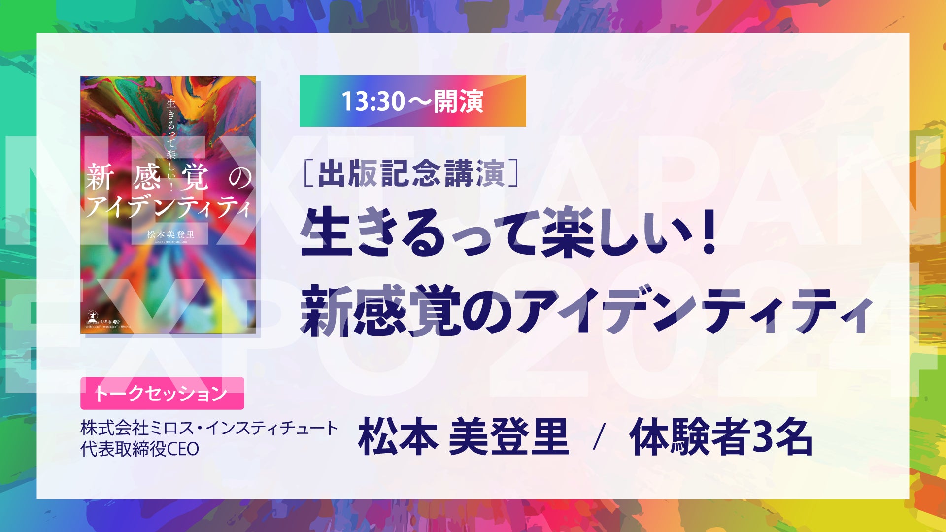 当選者のみがご参加いただける「Room A」エリアでは、NEXT JAPAN EXPを共催する株式会社ミロス・インスティチュート代表取締役CEOの松本美登里の新著「生きるって、楽しい~新感覚のアイデンティティー~」(https://qr.paps.jp/U01JY)(幻冬舎メディアコンサルティングより5月13日出版)の出版を記念した講演を開催。また、松本美登里とCHIBI UNITY代表 国友慎之助との対談他さまざまなプレゼンテーターからのプログラムなど、生きることの楽しさを伝え、幸せのカルチャーづくりに繋がるコンテンツを提供します。