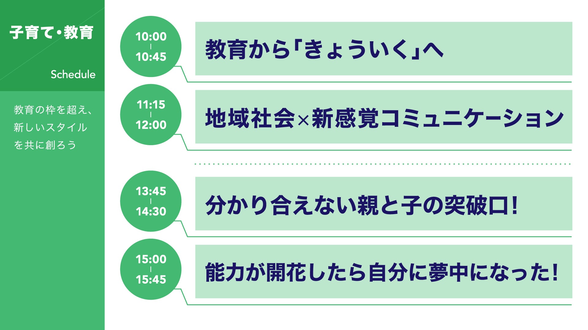 「子育て・教育」エリアでは、『教育から「きょういく」へ』をはじめ、子どもの不登校や不良行為といったの悩みに対し新しい視点を得られるなど、時間ごとに計4つのコンテンツを提供します。現役の高校生から教育のプロフェッショナルまで、教育に関わるさまざまな立場の人たちが意見を交わし、子育てや教育の在り方について目が覚めるような体験談を語り合います。