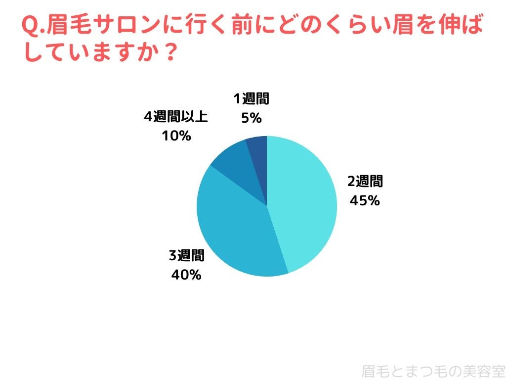 眉毛サロンに行く前に、眉を伸ばしていく期間は「2週間(45%)」が一番多いようです。次いで「3週間(40%)」、「4週間以上(10%)」、「1週間(5%)」という結果になりました。