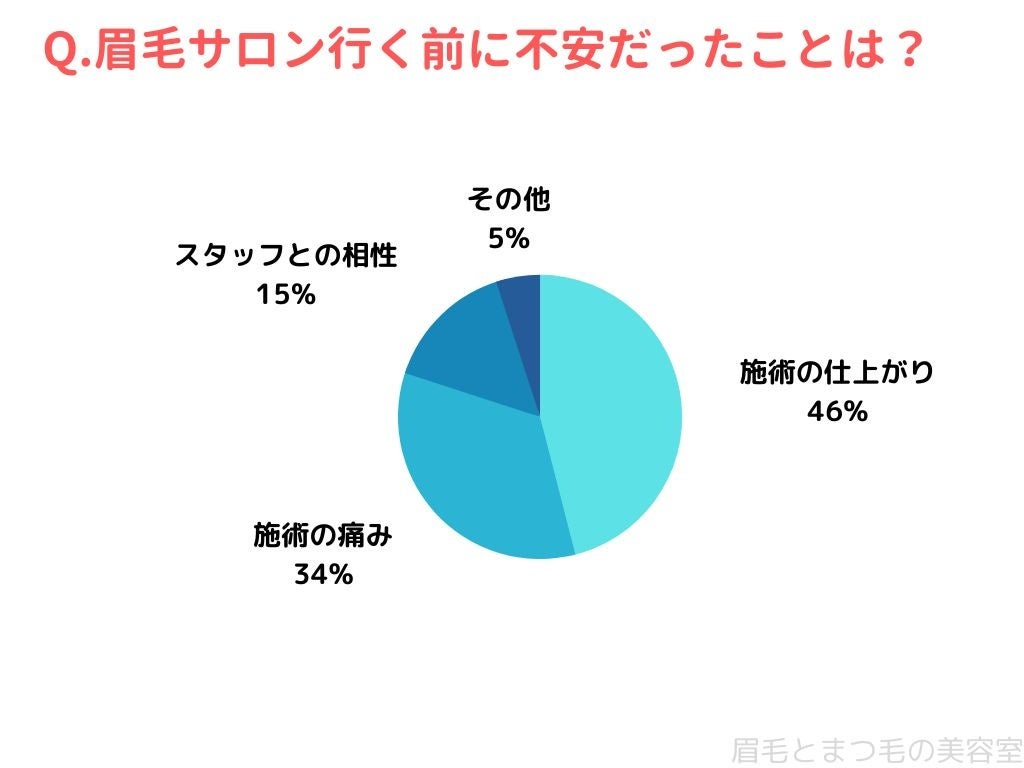 眉毛サロンの施術を受ける前は、仕上がりについて不安に思っている人が多いことが判明しました。仕上がりの内容は、スタッフの腕によるので、なかなか予想しにくいというのが不安の原因でしょう。眉毛サロンでは施術前にマッピング(完成イメージの作成)を行う眉毛サロンがあるので、そういったお店を選べば、施術前にイメージを共有しやすくなります。