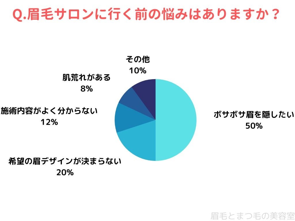 眉毛サロンに行く前の悩み第1位は「ボサボサ眉を隠したい(50%)」でした。続いて「希望の眉デザインが決まらない(20%)」「施術内容がよく分からない(12%)」がランクイン。
